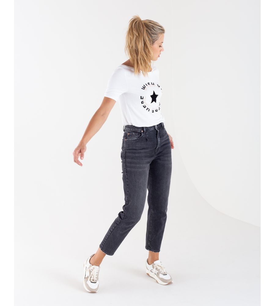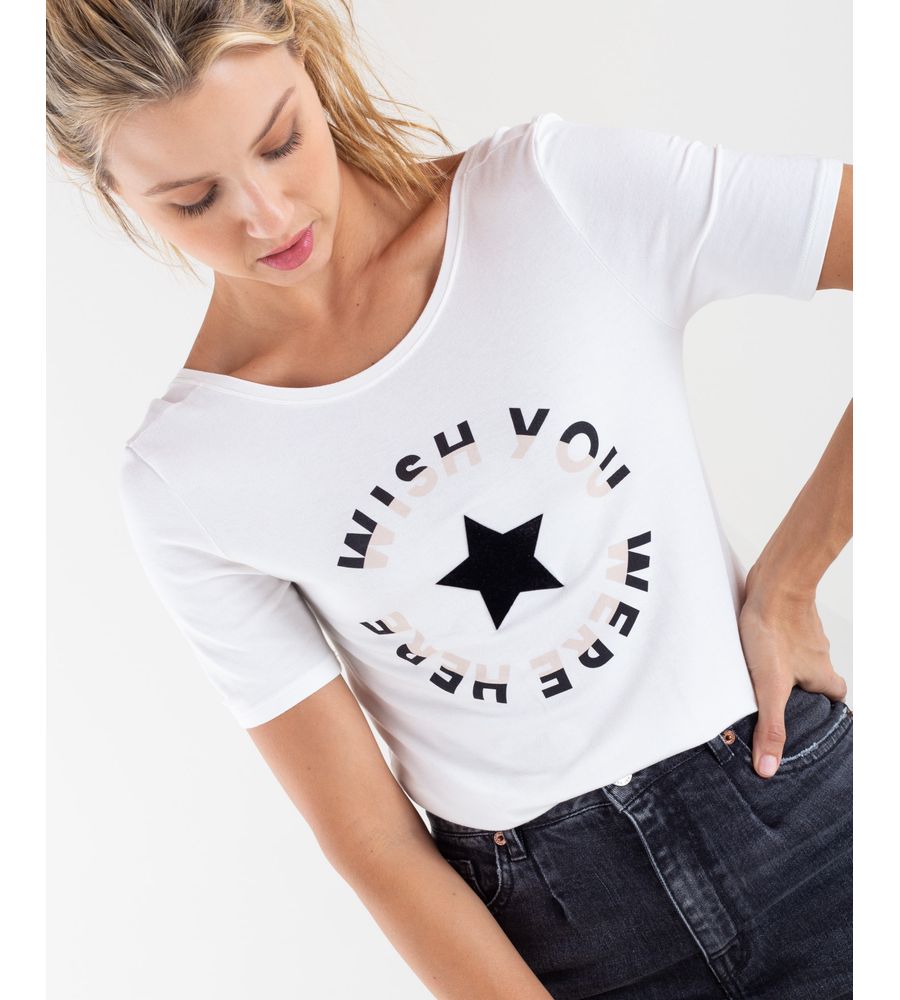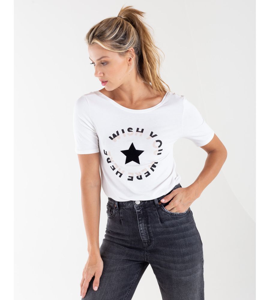Round neck T-shirt, short sleeves. • semi-fitted silhouette. • round neckline at the back. • combination of prints on the front with velvety textured flock technique appliqué. • perfect for creating weekend looks.
